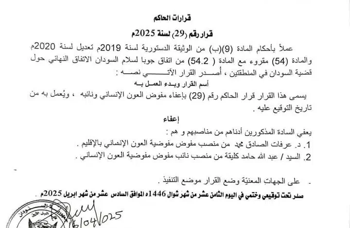 أصدر حاكم إقليم النيل الأزرق الفريق أحمد العمدة بادي قرارا الاربعاء 16 ابريل 2025م بإعفاء دكتور عرفات الصادق من منصبه كمفوض للعون الإنساني بالإقليم، بجانب إعفاء عبد الله حامد من منصبه كنائب للمفوض.