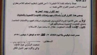 متابعات : عين الحقيقة أصدر والي ولاية نهر النيل، محمد البدوي، قرارا يقضي باستلام عهد وأمانات ما تسمي بالمقاومة الشعبية…